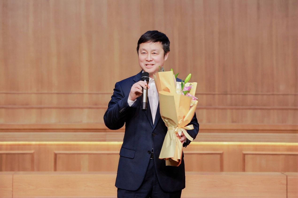 丁晓东在与李花老师携手演绎二重唱《紫藤花》后,分享感言。他深情回顾道:“犹记于上音歌剧院接过团旗的瞬间,我从合唱团粉丝蜕变为铁杆支持者。歌声自彼时的稚嫩走向如今的醇厚,正应“歌也美,声也美,牵梦余音绕梁飞”。五年来,我们在上海市教育工会的大力支持下,始终同心同行、从未分离。我们在合唱的浸润中沉醉不已,而这一切的精髓,正是润物无声的美育力量。“这番真挚话语引发全场强烈共鸣,在观众们热烈的掌声中,丁团长即兴演唱《两地曲》,深沉抒情的演绎将整场音乐会的氛围推向高潮。